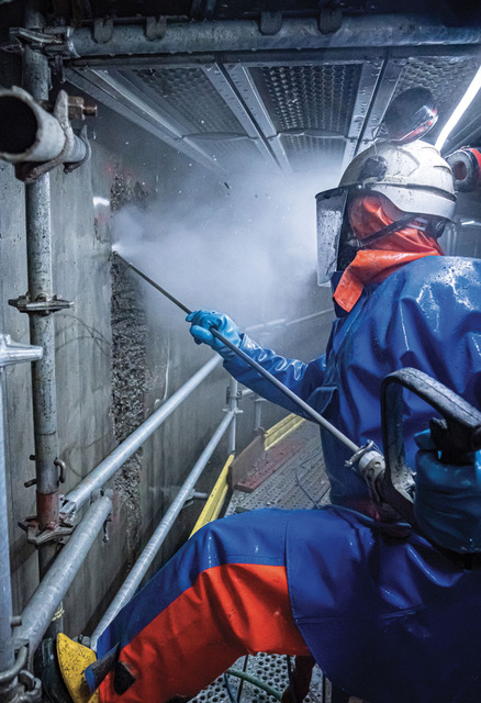 À cette hauteur, chaque geste compte. Le travail sur échafaudage dans un environnement clos impose une vigilance renforcée face aux projections de béton, à la réverbération du bruit dans l’espace cylindrique, et à la gestion rigoureuse des flexibles UHP, qui totalisent ici plus de 200 mètres linéaires.